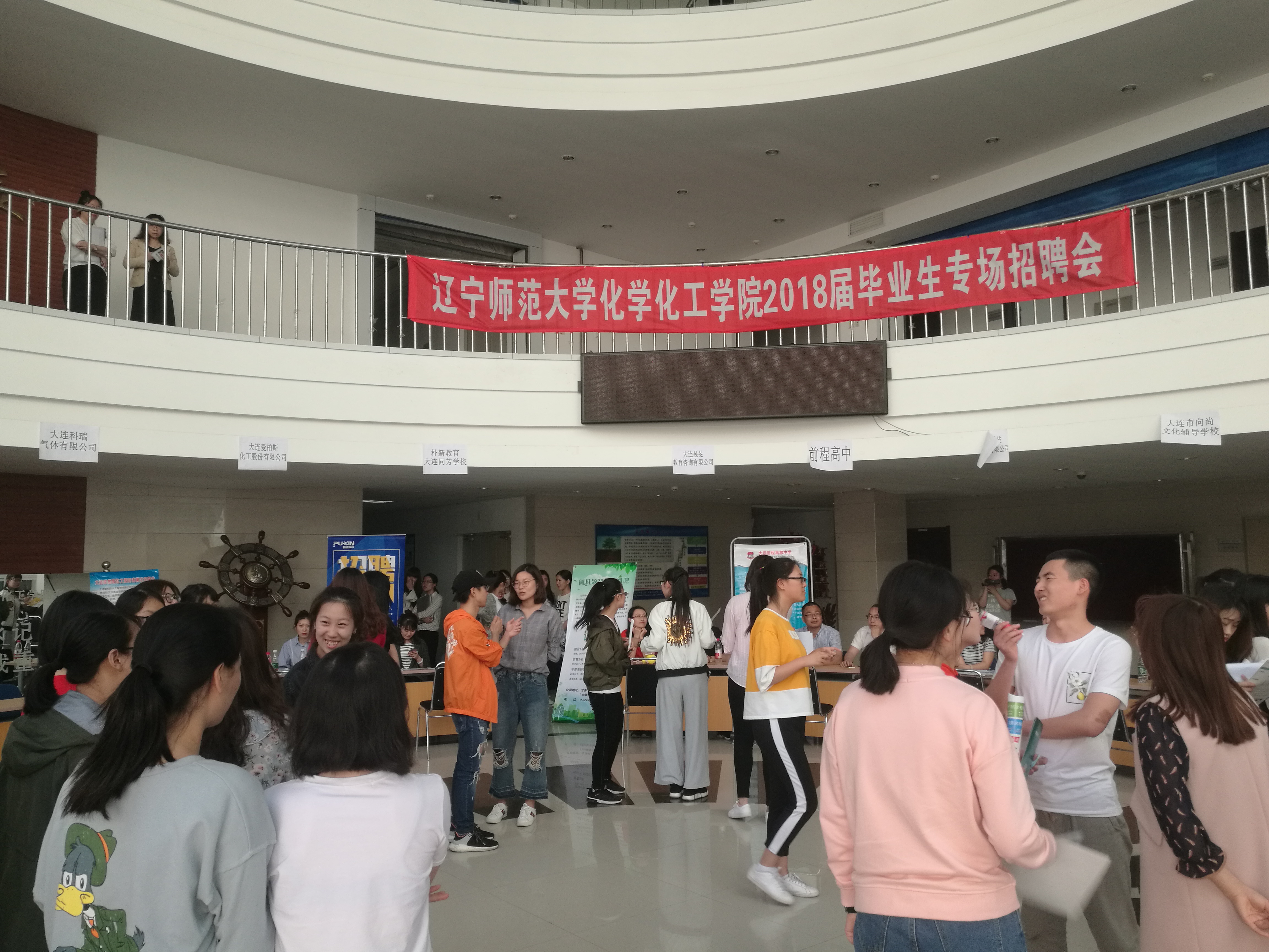 2018届毕业生专场招聘会在理化楼C区一楼大厅成功举办。本次招聘会共14个用人单位参会,为毕业生提供岗位将近 335个。其中不乏大连诚泽检测有限公司、大连亚泰科技新材料股份有限公司、大连爱柏斯化工股份有限公司、大连凯美化工工程配套有限公司、大连科瑞气体有限公司、前程高中、大连志成文化教育机构、大连新东方教育机构等省内知名企业和单位前来招聘,为毕业生就业提供了重要平台和广泛空间。