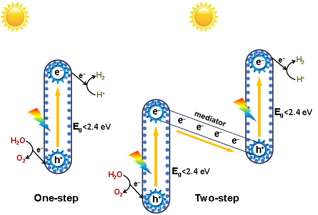 1.一步光激发法:根据热力学需求,一步光激发法要求半导体材料导价底的位置比质子还原电位更负,价带顶的位置比水氧化电位更正,同时考虑过电位的存在,满足全分解水需求的半导体禁带宽度最小为1.6 eV,对应的吸收带边为750 nm左右。本文列举了近五年来多种吸收带边大于500 nm且可实现一步光激发全分解水的无机半导体材料,主要集中于氮氧化物、硫氧化物以及离子掺杂氧化物。同时对构建一步全解水的关键问题:如何提升电荷分离、实现高效表面催化转化、抑制逆反应和提升材料稳定性等内容进行概述。