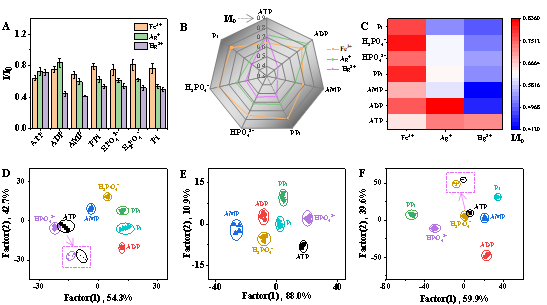 Figure 2. (A) Fingerprint, (B) radar gram, (C) heat map, and (D-F) LDA plots of N-PDA NPs-Mn+-TMB colorimetric array sensor towards seven phosphates. The concentrations of phosphates are (A-C, E) 6 μM, (D) 3 μM, and (F) 18 μM, respectively.