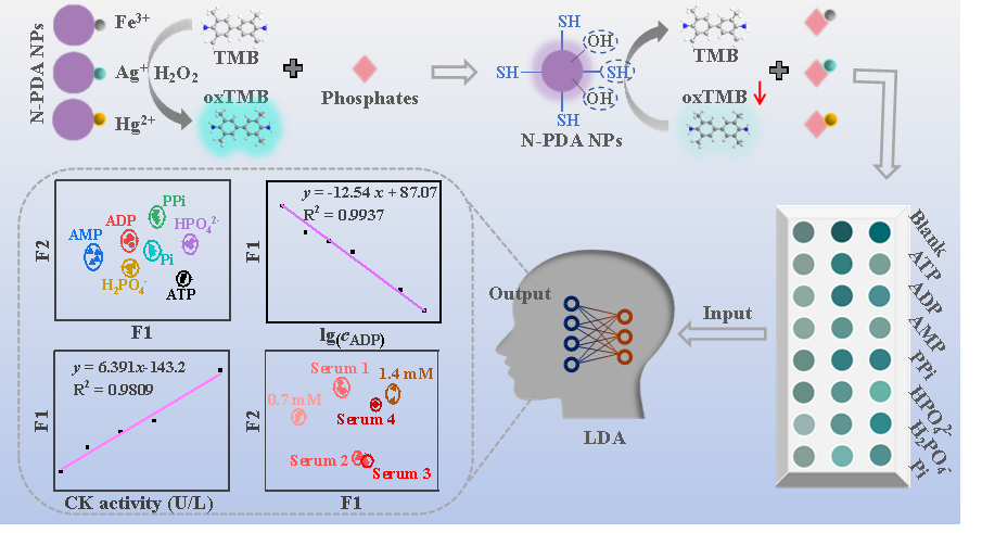 生理磷酸盐间高度的结构相似性为其快速、高选择性区分带来了严峻挑战。阵列传感策略利用有限传感单元与不同分析物产生的交叉反应性,将细微的识别差异转化为高分辨指纹图谱,为解决这一难题提供了强大工具。本研究基于多巴胺与不同生物硫醇之间的迈克尔加成反应,制备了三种具有不同表面修饰的聚多巴胺纳米颗粒(PDA NPs)。初步设计了由三种PDA NPs、九种金属离子和3,3′,5,5′-四甲基联苯胺(TMB)组成的高维双信号阵列传感器。采用决策树和线性判别分析算法作为核心设计工具,以识别最有效的传感单元,从而开发出一种简化的N-乙酰-L-半胱氨酸PDA NPs(N-PDA NPs)-Fe3+、Ag+、Hg2+-TMB比色阵列传感器,并将其应用于磷酸盐检测。磷酸盐和PDA NPs对金属离子的竞争性结合诱导了TMB氧化产物(oxTMB)量的差异变化,生成独特的指纹响应模式。该传感器成功区分了等浓度条件下的七种磷酸盐(ATP、ADP、AMP、PPi、HPO42-、H2PO4-和Pi),以及不同浓度和不同配比的磷酸盐。更广泛的磷酸盐种类定量和未知磷酸盐的准确预测验证了传感器的稳健性。此外,该传感器实现了涉及磷酸盐的激酶活性监测。在复杂生物环境中表现出优异的抗干扰能力与高选择性。在加标血清中,磷酸盐回收率高达96%-114%。本研究首次成功建立了血清磷酸盐水平的直观评估模型,为诊断磷酸盐相关疾病提供了新思路。本研究通过机器学习算法的引入,解决了从高维复杂的传感阵列中,智能地提取最有效的传感单元,以实现传感器的理性设计与简化,从而突破传统“试错法”阵列传感器构建在优化效率与性能上的瓶颈。